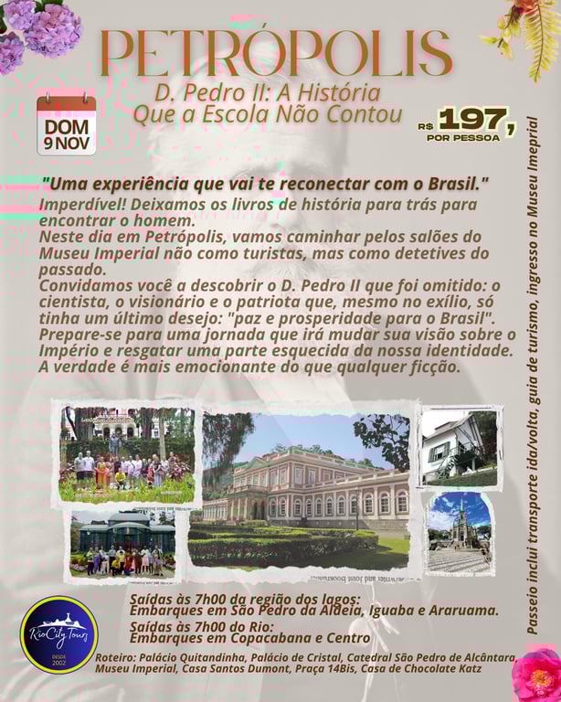 ✨ "Venha viver uma verdadeira viagem no tempo em Petrópolis! Neste passeio pela Cidade Imperial, você será conduzido por uma visita guiada única ao interior do Museu Imperial, onde a história ganha vida de forma leve, divertida e surpreendente! 👑