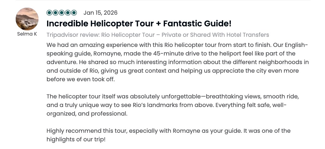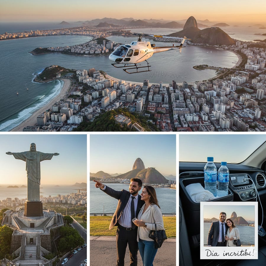 "Lá do alto, o Rio se revela em silêncio e esplendor — o Cristo abre os braços não só para a cidade, mas para quem voa com olhos encantados.As ondas desenham poemas na areia, o Pão de Açúcar se ergue como guardião de sonhos, e o coração bate no ritmo das asas que dançam com o vento. É como tocar o céu com os olhos e abraçar a cidade com a alma. Um voo breve, mas eterno na lembrança."